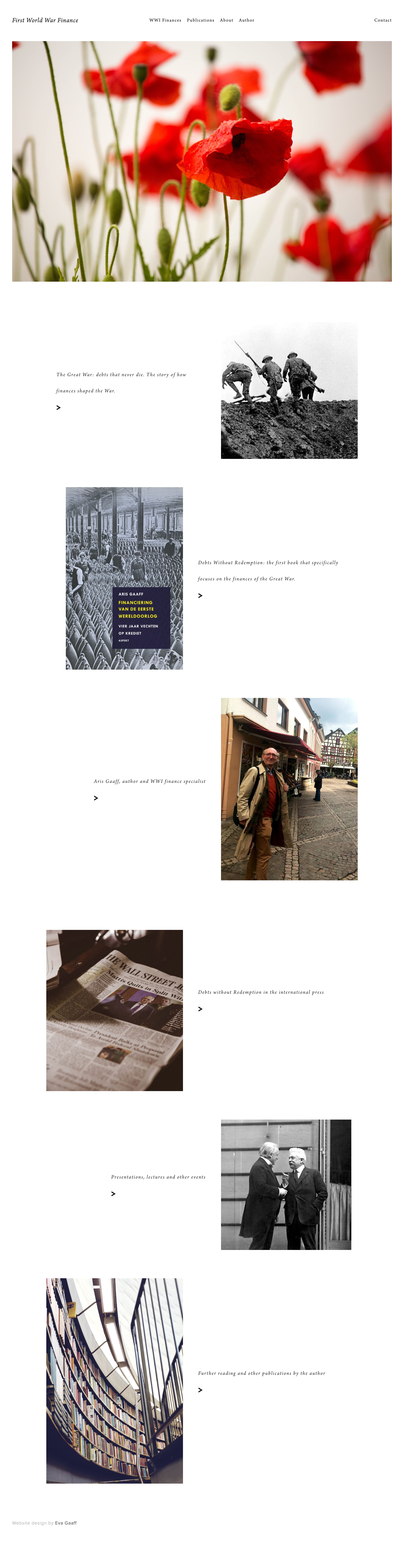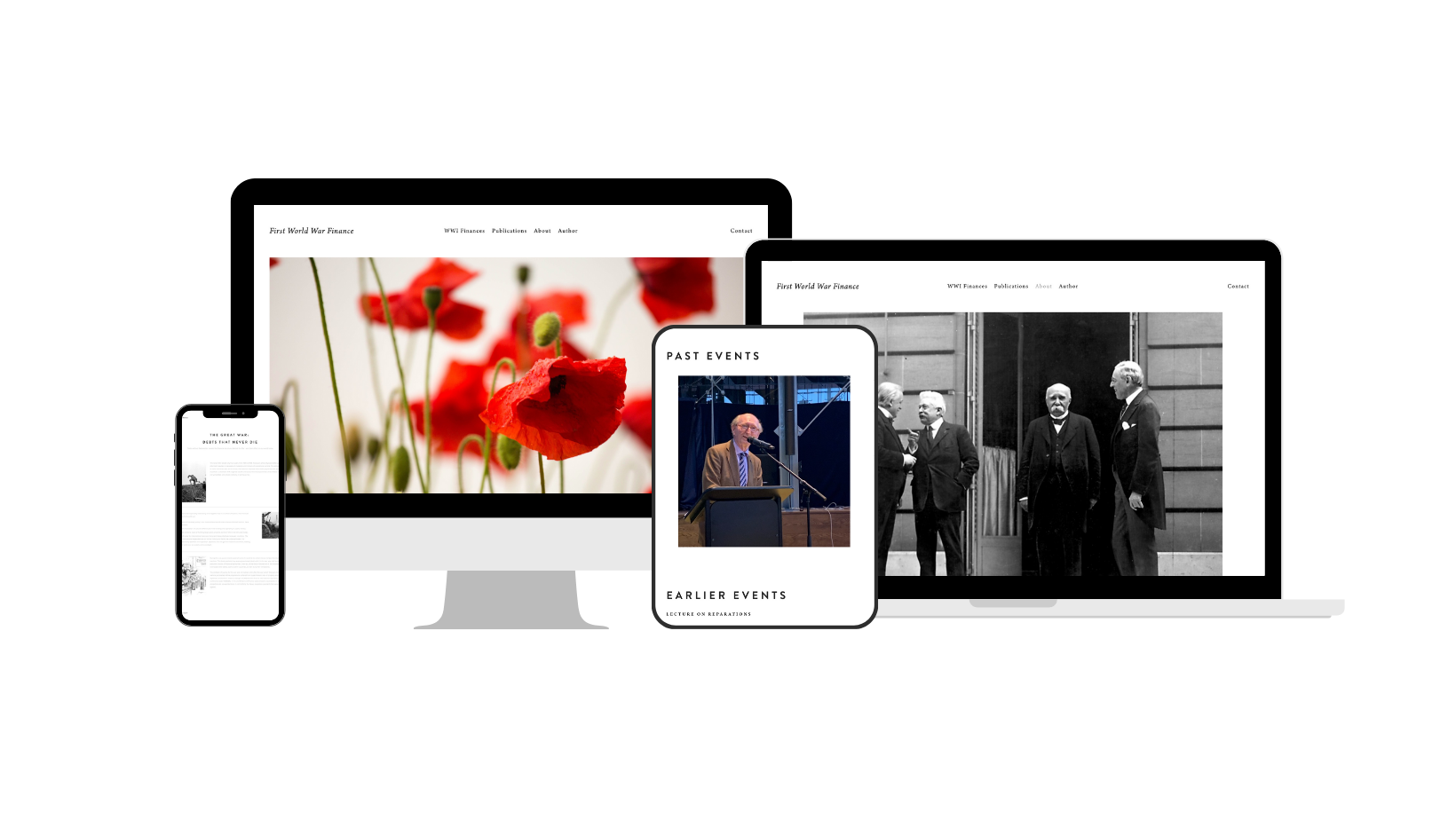 A minimalist website for a writer and historian specializing in World War finance, focused on promoting his book and scholarly work. The clean design keeps attention on the content—book details, speaking engagements, and published articles—while reflecting the author’s preference for simplicity. The structure prioritizes clarity and understated professionalism.